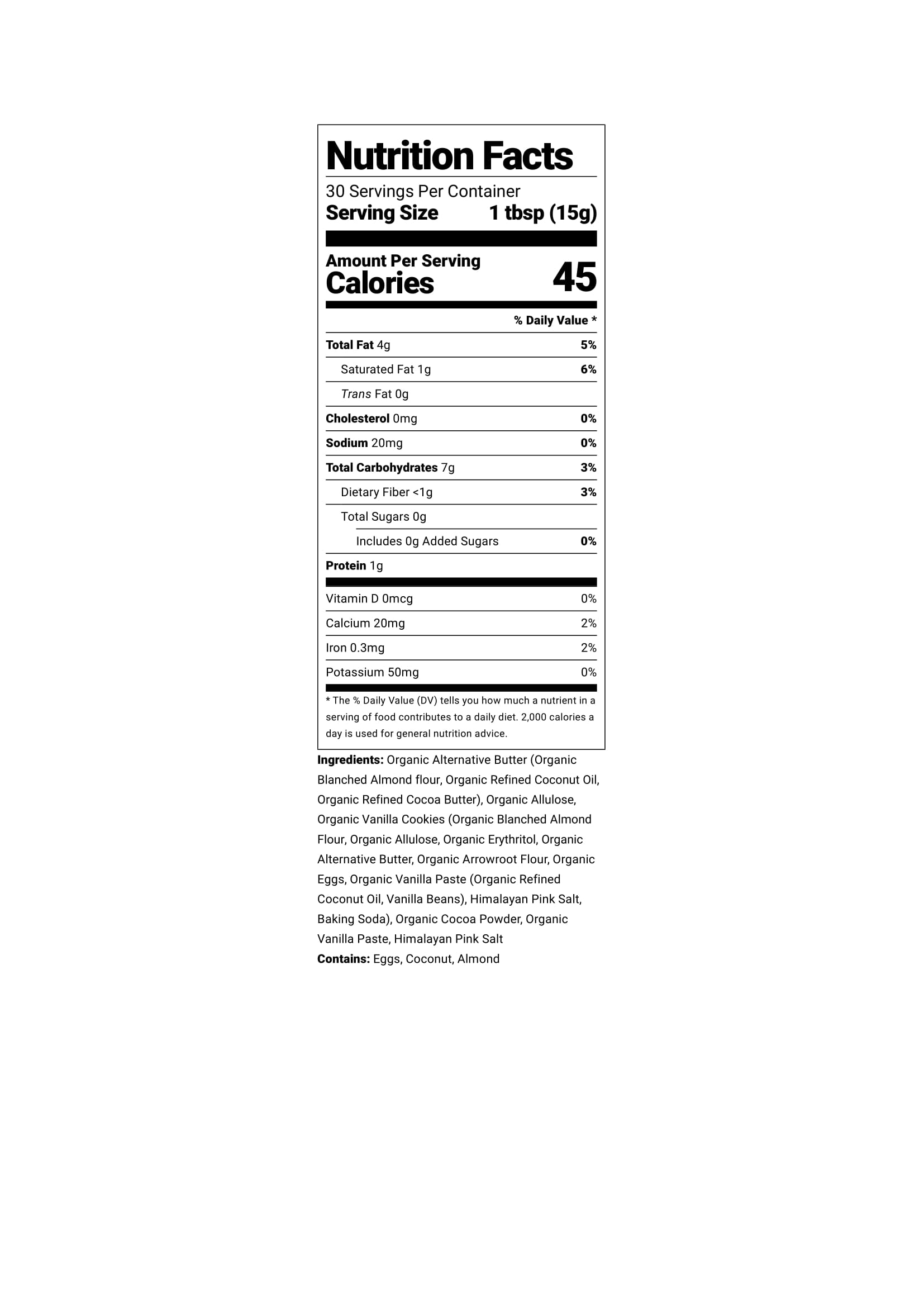 Organic Almond Flour, Organic Allulose, Organic Erythritol, Organic Cocoa Powder, Organic Coconut Oil, Organic Cocoa Butter, Organic Pasture Raised Eggs, Pink Himalayan Salt, Vanilla Bean, Baking Soda, Rosemary Extract.